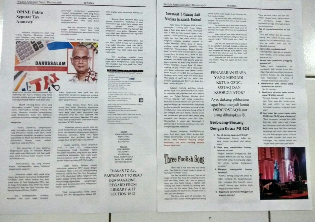 Kali ini anggota WARNA mampu menerbitkan sebuah Koran yang berisikan tentang berbagai macam hal. Seperti berita headline yang sedang marak diperbincangkan oleh banyak masyarakat, kegiatan atau acara-acara besar di pesantren hingga beberapa karya santri seperti pantun, puisi, cerita pendek dan masih banyak lagi. Alhamdulillah dengan semakin bertambahnya dunia informasi dan teknologi yang melesat begitu cepat mampu dimanfaatkan oleh para santri darunnajah 2 cipining dalam menuangkan karya-karyanya.