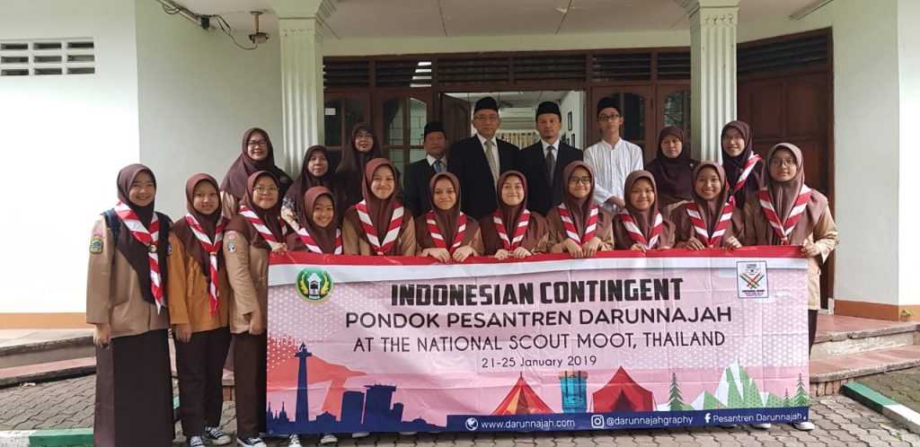 Pimpinan Pesantren Darunnajah Jakarta, K.H. Sofwan Manaf, M.Si beserta beberapa Ustadz Senior turut serta melepas kontingen pramuka yang akan berangkat ke Thailand di Baitul Waqif, sabtu, 19 Januari 2019.