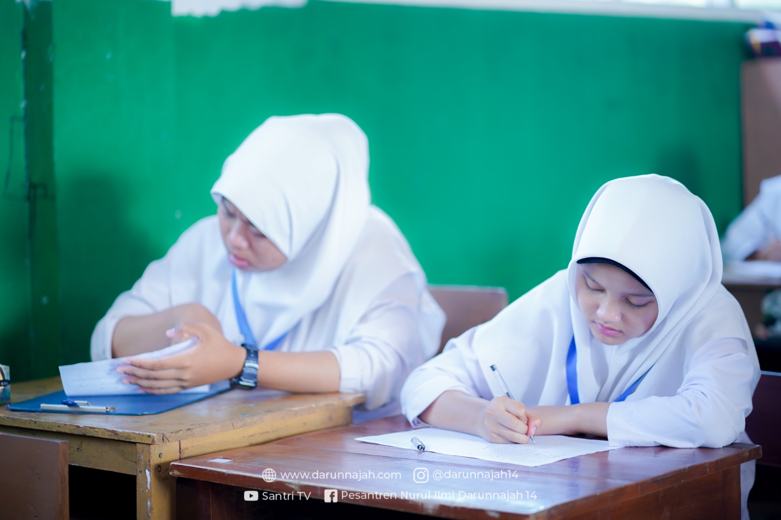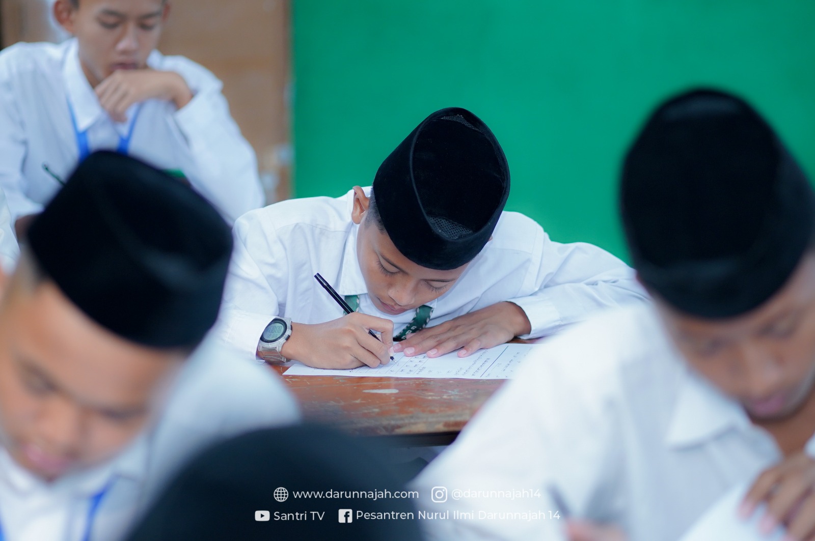 Dalam suasana serius dan khidmat, setiap santri mengerjakan soal ujian dengan telaten. Mereka menunjukkan fokus dan konsentrasi, membenamkan diri dalam setiap pertanyaan untuk mengeluarkan yang terbaik dari kemampuan mereka. Semangat untuk belajar dan berprestasi tercermin dalam setiap goresan pena di atas kertas ujian.