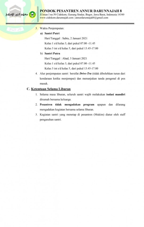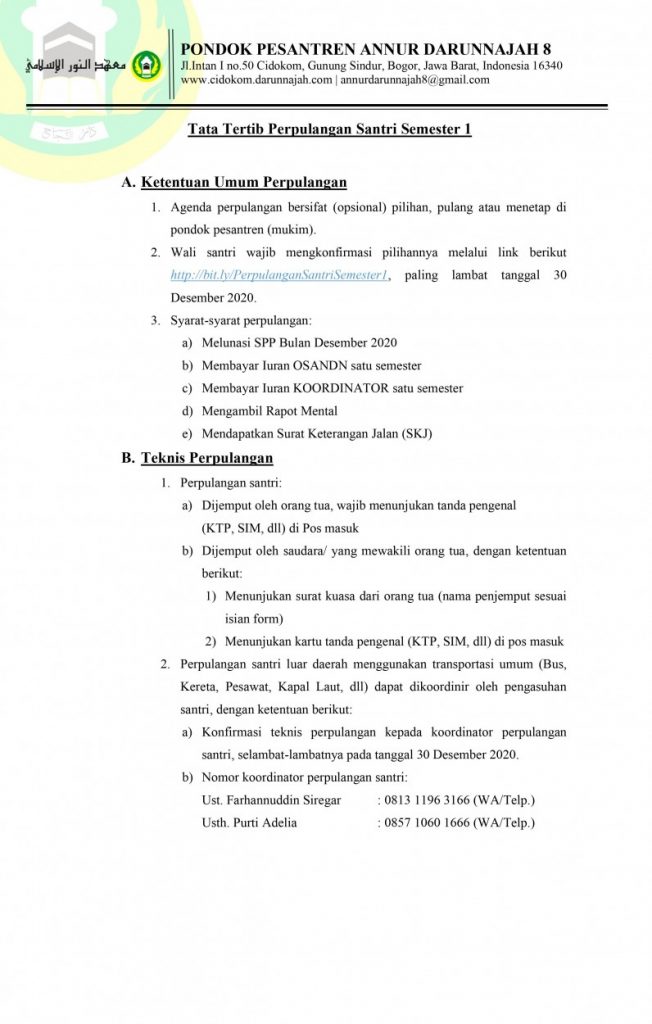 Berikut ini lampiran tata tertib perpulangan santri semester 1 pesantren Annur Darunnajah 8.